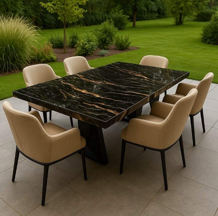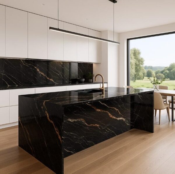 Unikalny wygląd: Dynamiczna, czarna powierzchnia z żyłami w kolorach ziemi przyciąga wzrok i buduje niepowtarzalny klimat wnętrza. Każdy blat jest inny – nie ma dwóch identycznych wzorów.