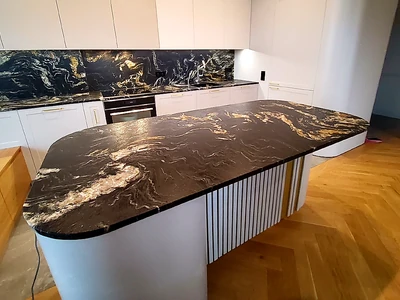 Konglomerat kwarcowy to innowacyjny materiał stworzony z około 95% naturalnego kwarcu, połączonego z żywicami i pigmentami. Jego powierzchnia jest idealnie gładka, łatwa w czyszczeniu i nie wymaga impregnacji. W odróżnieniu od niego, blat kuchenny z granitu Belvedere to esencja natury – elegancki, wyrazisty i pełen głębi. Czerń kamienia przeplatają złote i białe żyły, tworząc spektakularne, niepowtarzalne wzory. Każdy blat Belvedere to unikalne dzieło natury, którego nie da się skopiować. Naturalna struktura i kontrastowe detale wprowadzają do kuchni luksus, autentyczność i wyjątkowy charakter. Jeśli szukasz blatu, który zachwyca indywidualnością i ponadczasową klasą – granit Belvedere będzie idealnym wyborem