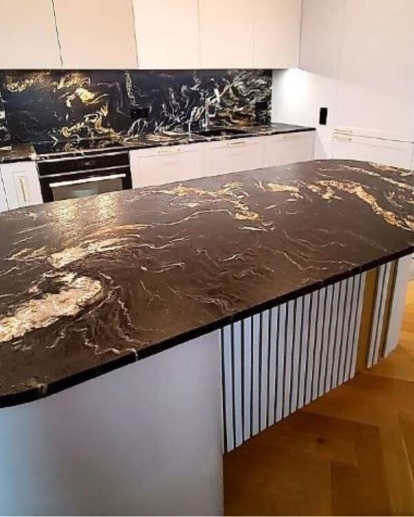 Blat granitowy Belvedere to kwintesencja luksusu i klasy – czarna podstawa kamienia jest tłem dla efektownych żył i smug, które mogą przybierać barwy od bieli, przez krem, aż po miedź i złoto. To nie tylko blat – to ozdoba, manifestacja stylu i wyrafinowania.