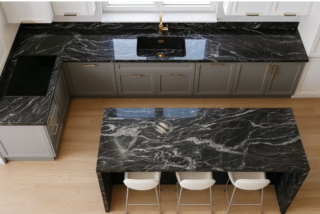 Czarny blat granitowy Forest Black z białymi żyłkami w kuchni z wyspą – wyspa kuchenna z tego materiału staje się centralnym punktem otwartej przestrzeni, idealna do kuchni połączonej z salonem.