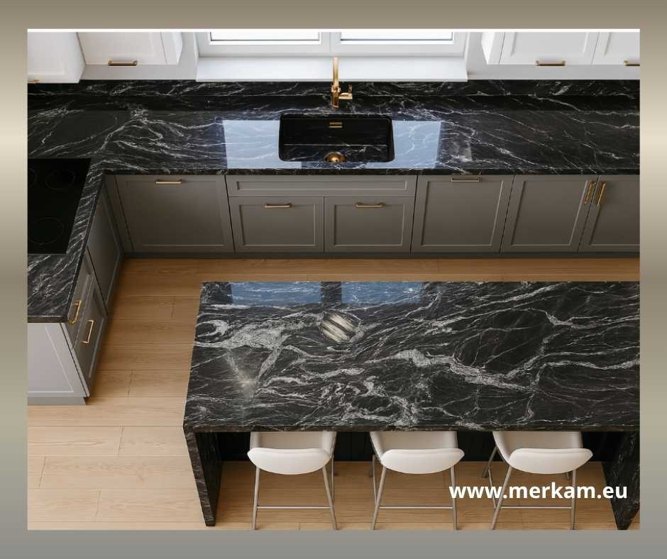 Luksusowy blat kuchenny z granitu Forest Black do kuchni glamour – połyskliwa powierzchnia i dynamiczne żyłkowanie doskonale komponują się ze złotymi lub srebrnymi dodatkami, kryształowymi lampami i eleganckimi frontami.