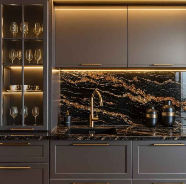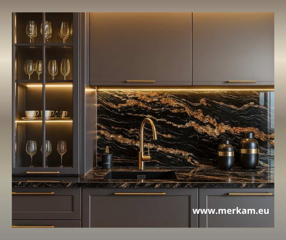 Luksusowy efekt – połączenie czerni z żyłami beżu i złota tworzy spektakularny efekt, który podnosi prestiż całej aranżacji kuchennej.