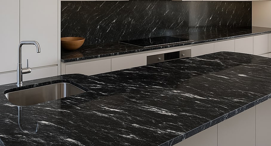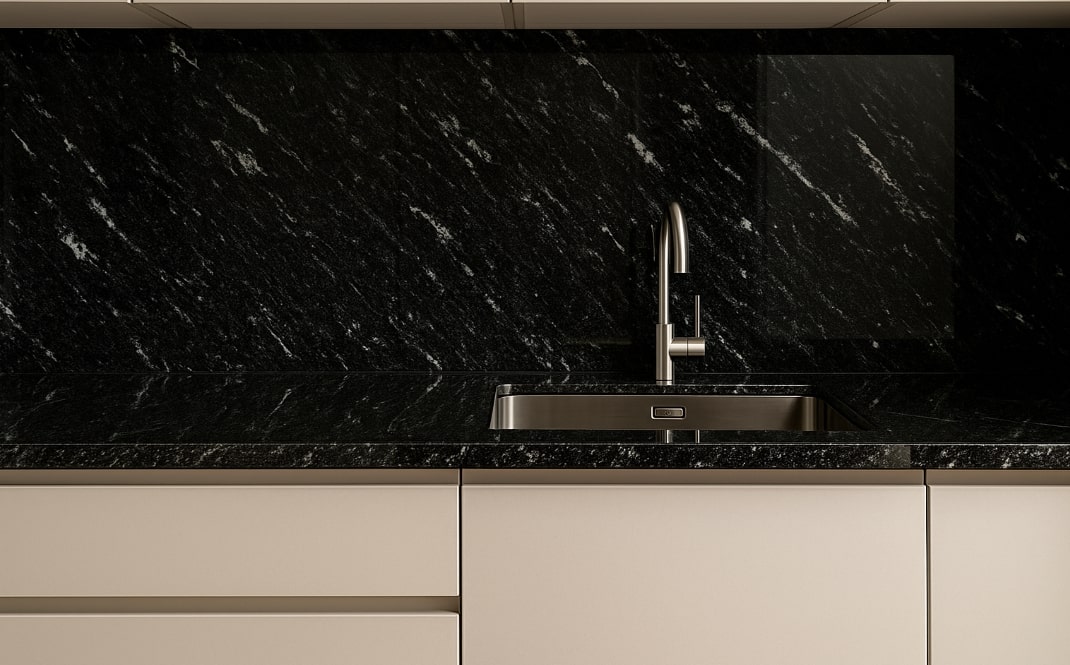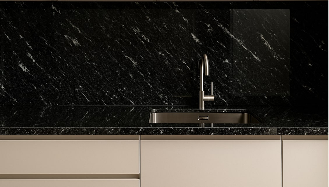 Głęboka czerń z dynamicznym, białym żyłowaniem to cecha charakterystyczna granitu Via Lattea. Taki blat: