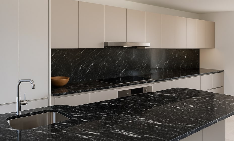 Blat kuchenny z granitu Via Lattea, choć ciemny, może optycznie powiększyć przestrzeń w jasnych wnętrzach, dzięki swojej polerowanej powierzchni, która odbija światło, nadając głębię i rozmach.