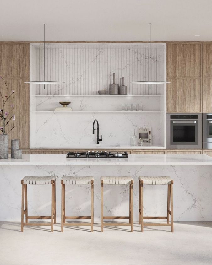 W tej inspiracji, Bianco Venato tworzy harmonijny kontrast między czystą bielą a ciepłymi, drewnianymi akcentami. Został połączony z naturalnymi, matowymi frontami z fakturą drewna, czarną armaturą i pionowym, ryflowanym panelem na ścianie, uzyskując luksusowy, stonowany efekt w stylu Japandi (połączenie minimalizmu skandynawskiego i japońskiego).