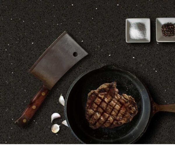 Poczuj wyrafinowanie! Ten czarny blat z konglomeratu kwarcowego ze srebrnymi szkiełkami jest idealny do wnętrz w stylu klasycznym, kolonialnym, eleganckim Modern Classic oraz do kuchni intensywnie użytkowanych. Dzięki zerowej porowatości, zyskujesz bezobsługowy, w pełni higieniczny blat całkowicie odporny na plamy i zarysowania. Zobacz, dlaczego ten idealny, czarny blat do klasycznej kuchni jest obecnie w czołówce wyborów projektantów, którzy cenią sobie elegancję i łatwość utrzymania czystości.