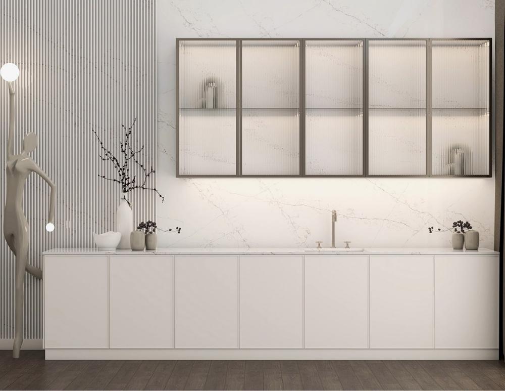 Wyjątkowe, ciepłe żyłkowanie inspirowane najszlachetniejszym włoskim marmurem Statuario, wzbogacone o akcenty złota i miedzi, sprawia, że kuchnia zyskuje charakter galerii sztuki, pozostając przy tym maksymalnie funkcjonalna i łatwa w utrzymaniu czystości.