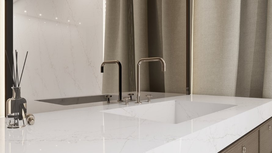 • Blaty kuchenne i łazienkowe: To fundamentalne zastosowanie. Blat łazienkowy z konglomeratu kwarcowego Statuarietto Gold zapewnia ten sam luksusowy wygląd marmuru Statuario, ale bez obaw o plamy z kosmetyków czy osadzanie się kamienia.