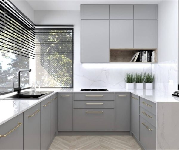 | Modern Classic / Minimalizm | Gładkie fronty w odcieniach ciepłej szarości (taupe) lub złamanej bieli. | Satynowy nikiel, czarny mat. | Idealny balans. Statuario Gold dodaje ciepła i charakteru stonowanemu wnętrzu. |