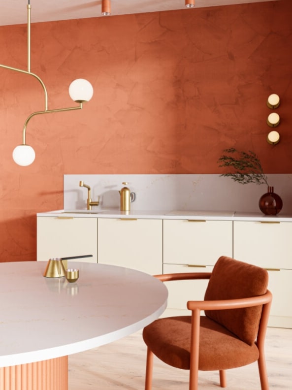 W tle widoczna jest strefa kuchenna, gdzie ten sam konglomerat pokrywa zarówno blat roboczy, jak i ścianę nad nim. Dzięki temu wnętrze zyskuje na jednolitości i elegancji. Ciepła paleta barw, od terakotowych ścian po kremowe fronty szafek ze złotymi uchwytami, tworzy przytulną i luksusową atmosferę. Całość dopełniają złote detale: bateria, designerska lampa nad stołem oraz akcesoria, które wnoszą do wnętrza poczucie wyrafinowania i harmonii. To idealny przykład kuchni w odcieniach złota i beżu, gdzie materiały i kolory wzajemnie się podkreślają.