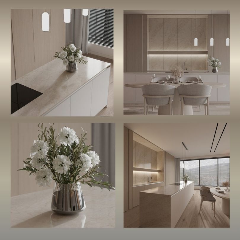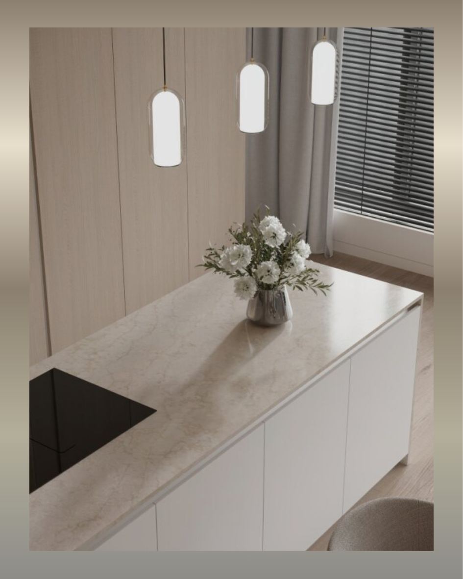 Blat kuchenny Technistone Glencoe to konglomerat kwarcowy w odcieniu greige z delikatnym, nieregularnym użyleniem inspirowanym marmurem. Jest to materiał projektowany do intensywnego, codziennego użytkowania w kuchniach, łazienkach i zabudowach meblowych, przy zachowaniu wyglądu kamienia naturalnego. Sprawdza się szczególnie tam, gdzie priorytetem jest odporność na plamy i łatwe utrzymanie czystości, a nie pełna przypadkowość naturalnego kamienia.
