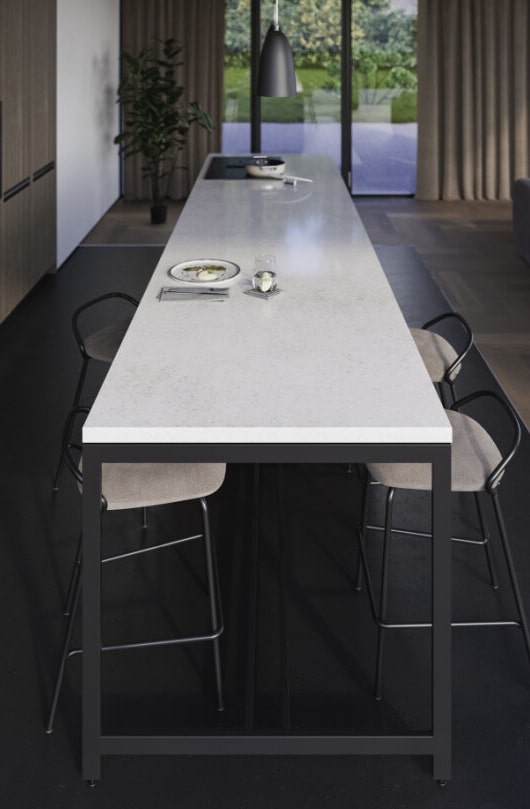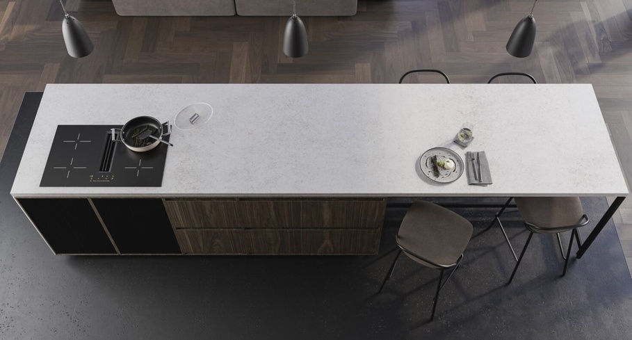 Ten blat kuchenny z konglomeratu Technistone Wedding Lily jest niczym kameleon, który dostosuje się do wielu aranżacji: