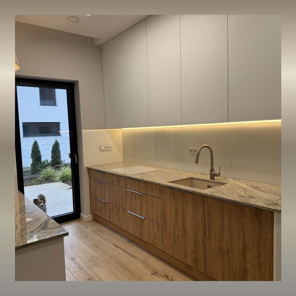 Powierzchnia bez łączeń: Dzięki dostępowi do wyjątkowo dużych płyt (slabów) granitu Colonial Gold, mogliśmy zrealizować wizję kuchni o idealnie spójnym wyglądzie. Imponujące wymiary surowca pozwoliły na wykonanie blatów w taki sposób, że w żadnym miejscu nie było wymagane łączenie kamienia. Dzięki temu naturalny wzór granitu zachowuje ciągłość na całej długości, co potęguje wrażenie luksusu i ułatwia utrzymanie idealnej czystości.