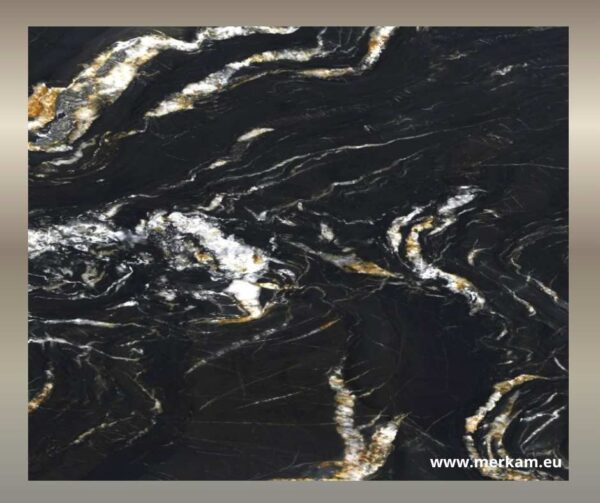 Unikalny wygląd: Mocne, kontrastowe smugi czerni, bieli i złota tworzą spektakularny efekt wizualny, który przyciąga wzrok i nadaje wnętrzom luksusowego charakteru.