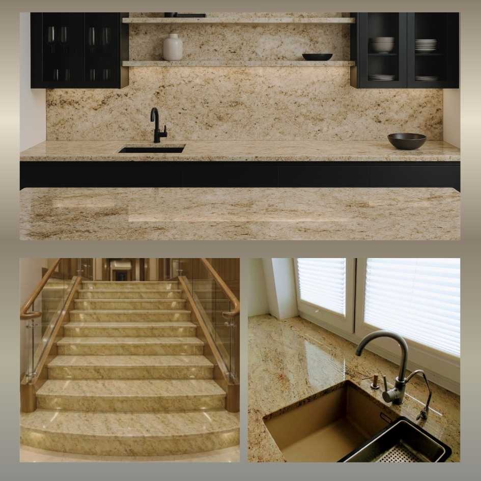 Wysoka trwałość: Granit Kashmir Gold jest odporny na zarysowania, ścieranie, wysoką temperaturę i wilgoć, co czyni go idealnym do kuchni, łazienek i przestrzeni komercyjnych.
