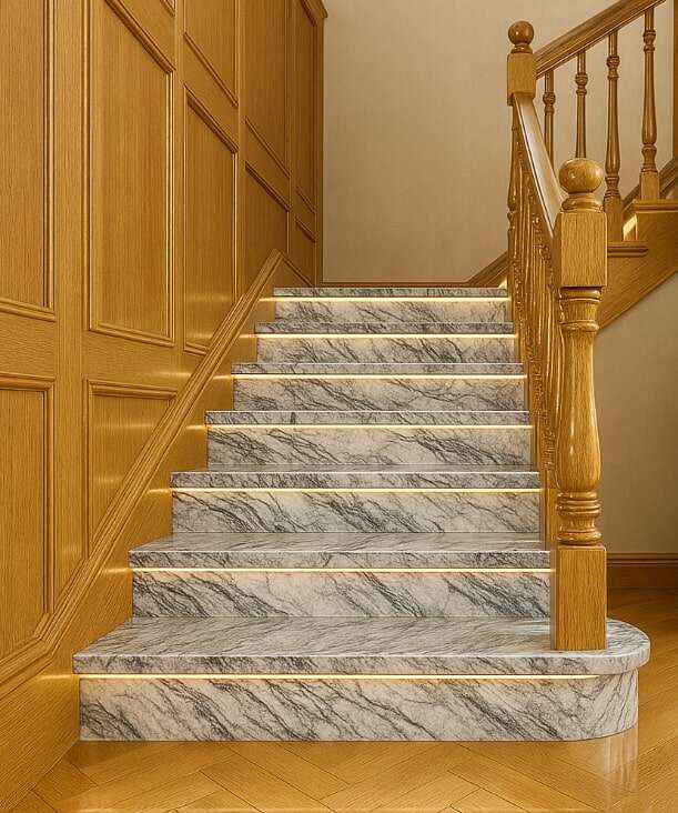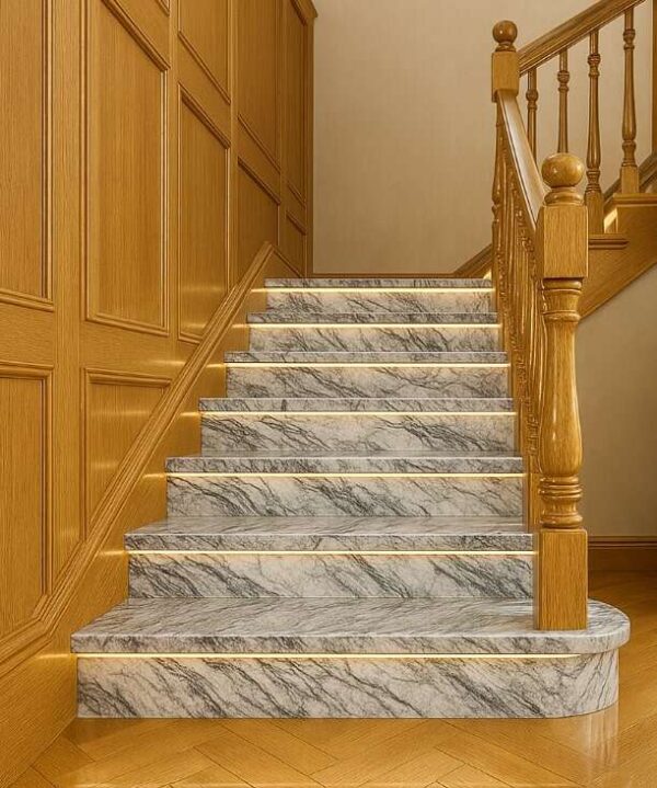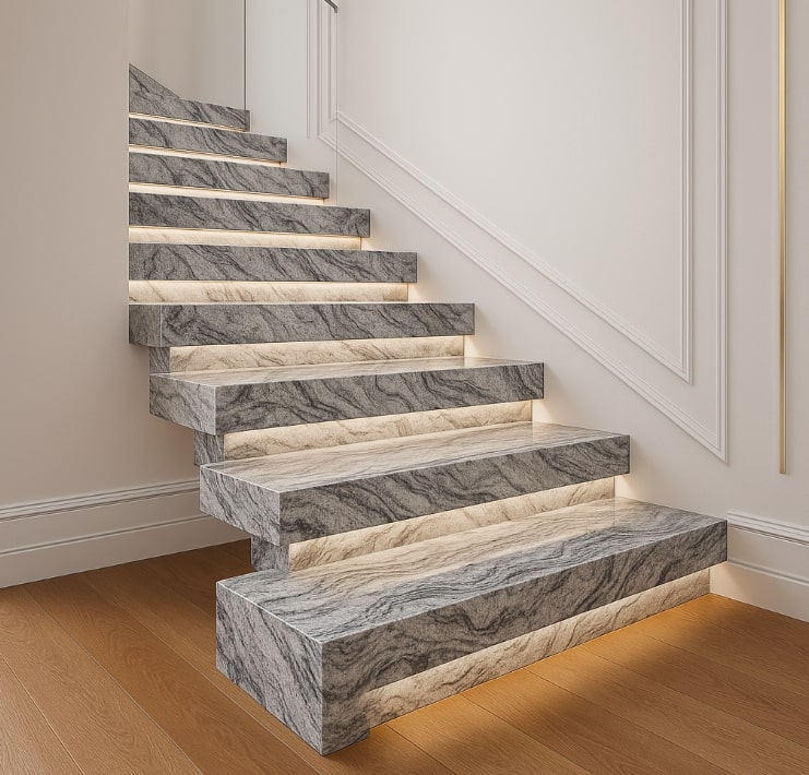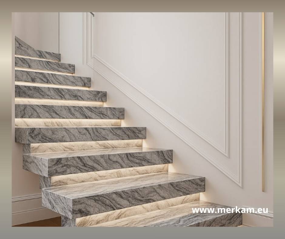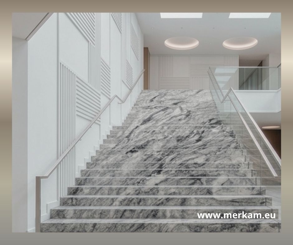 Uniwersalność aranżacyjna: Jasna kolorystyka i delikatne żyły granitu Viscount White sprawiają, że schody pasują zarówno do wnętrz nowoczesnych, jak i klasycznych, a także do przestrzeni komercyjnych i publicznych.